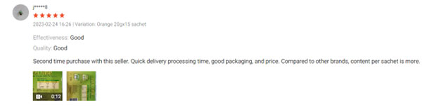 Second time purchase with this seller. Quick delivery processing time, good packaging, and price. Compared to other brands, content per sachet is more.